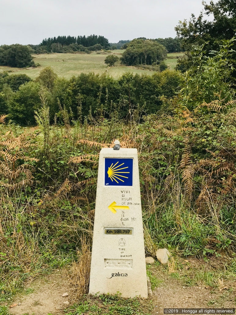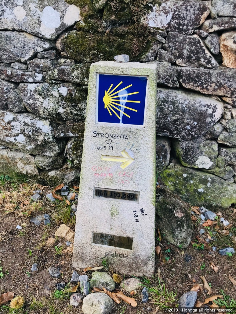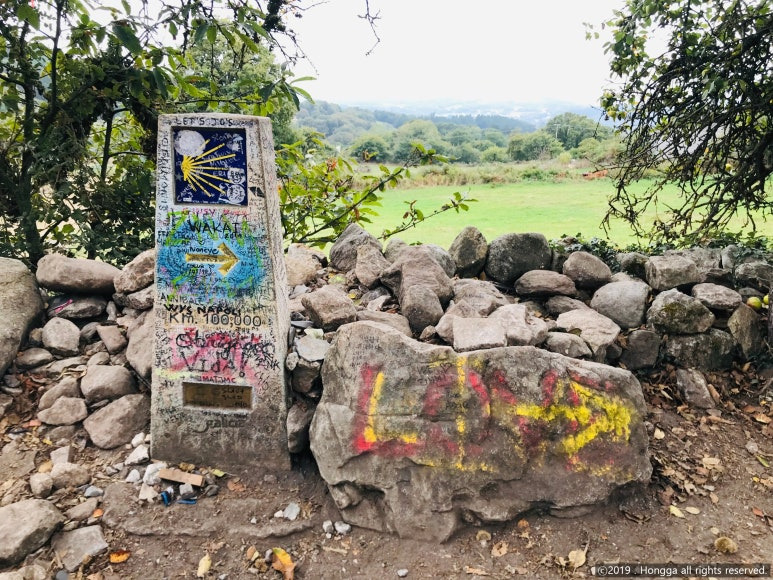 100km 표지석 답게 순례자들이 옹기종기 모여 기념 사진을 찍고 있었고,