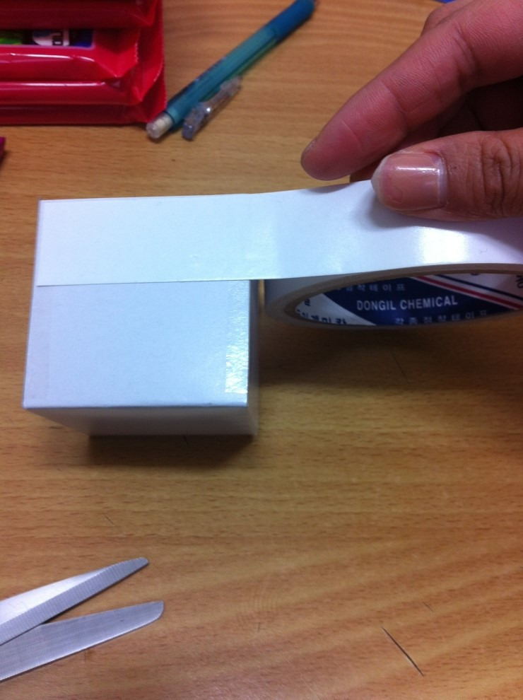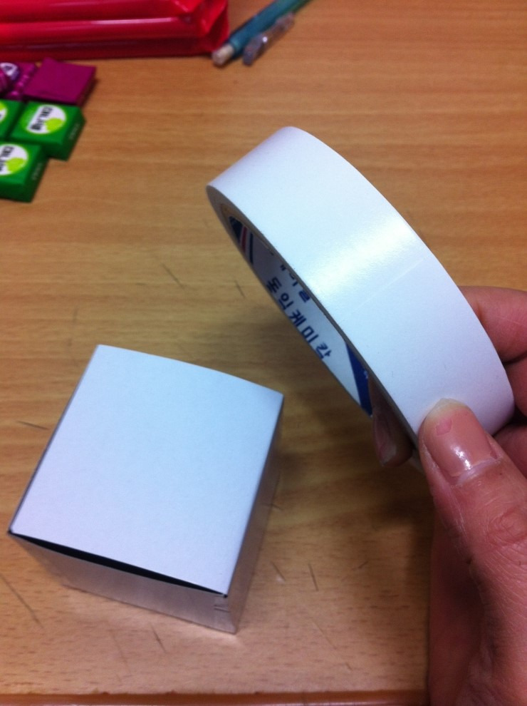 짜잔! 이렇게 테이프로 고정해서 상자를 만들었습니다! 당연히 뚜껑쪽에는 테이핑을 하면 안돼겠죠??상자안에 초콜렛을 채워 넣으려면요~