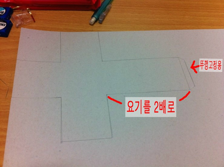 어렷들때 학교에서 무언가 만들기 할때 배워보셨죠? 정육각정 만들기!!십자모양에 한쪽면을 두배로 늘려서 요로케 그리고, 뚜껑쪽으로 살포시 고정용 면을 그려주는 센스!!
