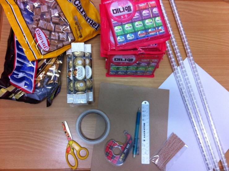 준비물 부터 챙겨봅니다+_+미니쉘 초콜렛 색상별로! 얇은도화지, 양면테이프, 가위, 스카치테이프, 자, 연필, 투명포장지, 빵끈